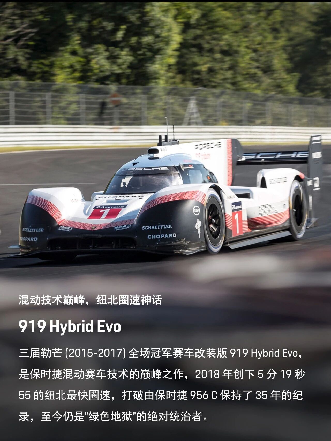 三届勒芒(2015-2017)全场冠军赛车改装版 919 Hybrid Evo,是保时捷混动赛车技术的巅峰之作,2018 年创下 5 分 19 秒 55 的纽北最快圈速,打破由保时捷956 C保持了 35 年的纪录,至今仍是"绿色地狱"的绝对统治者。它凝聚了保时捷在耐力赛中积累的顶尖混动技术,将内燃机与电机的协同效能发挥到极致,无需受赛事规则限制的改装升级,让其性能达到了前所未有的高度。这台赛道王者的亮相,不仅是保时捷赛车技术的一次极致展示,更印证了品牌在动力科技领域的前瞻探索。
