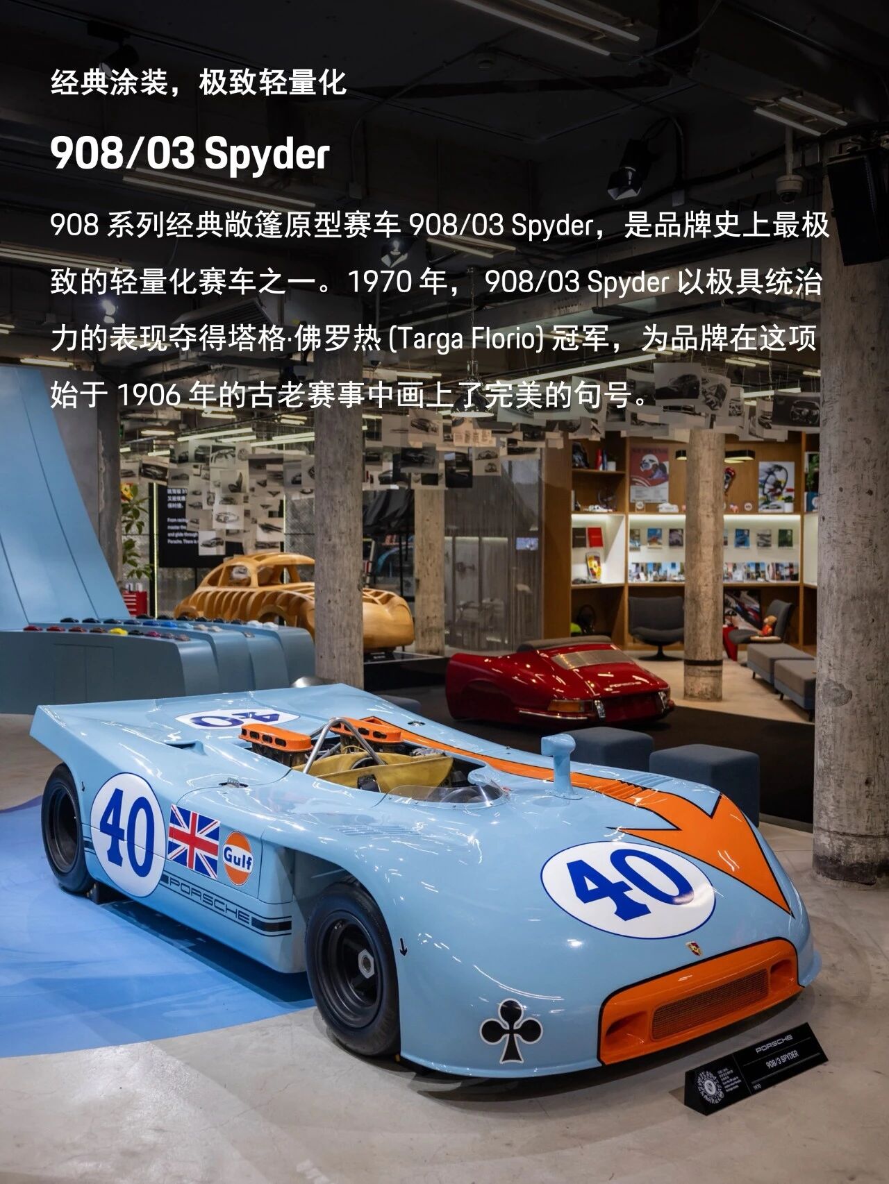 908 系列经典敞篷原型赛车908/03 Spyder,是品牌史上最极致的轻量化赛车之一。1970年, 908/03 Spyder以极具统治力的表现夺得塔格·佛罗热(Targa Florio)冠军——这也是保时捷在这项传奇公路耐力赛中的最后一次胜利,为品牌在这项始于1906年的古老赛事中画上了完美的句号。其标志性的海湾石油蓝橙涂装成为赛车史上的不朽符号,是无数车迷心中的经典记忆。历经岁月,908 Spyder 依旧气场十足,展现了那个年代工程师对轻量化的极致追求。
