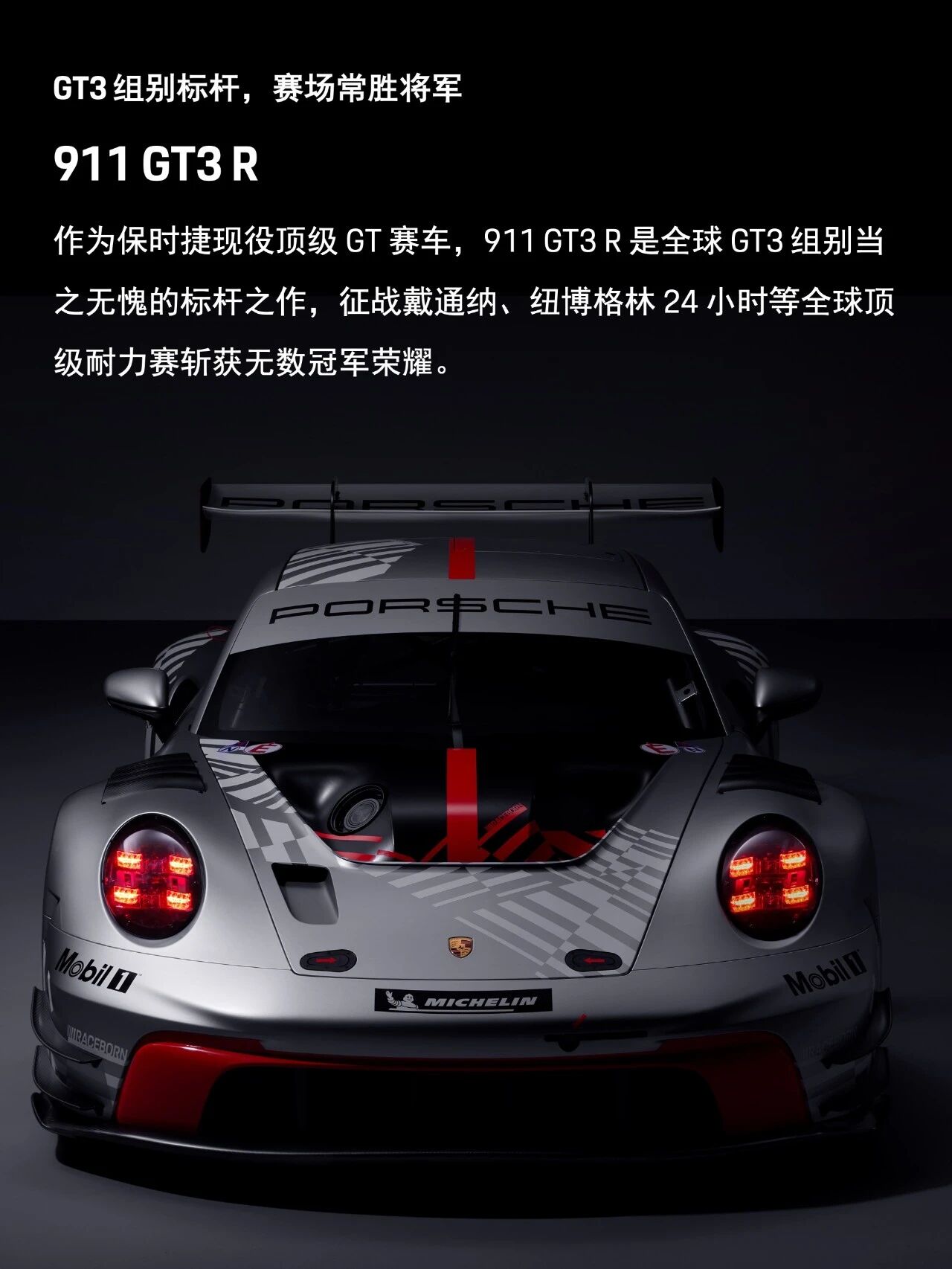 作为保时捷现役顶级GT赛车,911 GT3 R 是全球 GT3 组别当之无愧的标杆之作,征战戴通纳、纽博格林24小时等全球顶级耐力赛斩获无数冠军荣耀。2024 年勒芒 24 小时耐力赛中,它更是一举拿下新设立的 LMGT3 组别冠军,成为首个以 GT3 赛车问鼎勒芒的车型;2025 年成功卫冕,实现该车型在勒芒的两连冠。在2026年3月刚结束的赛百灵12小时耐力赛上,这台速度机器再次证明其统治力,包揽 GTD Pro 组别冠亚军。极致的空气动力学设计、调校精准的赛车底盘,以及澎湃的动力输出,让它成为赛道上令对手敬畏的速度机器,也彰显着保时捷将赛道技术不断推向极致的执着。