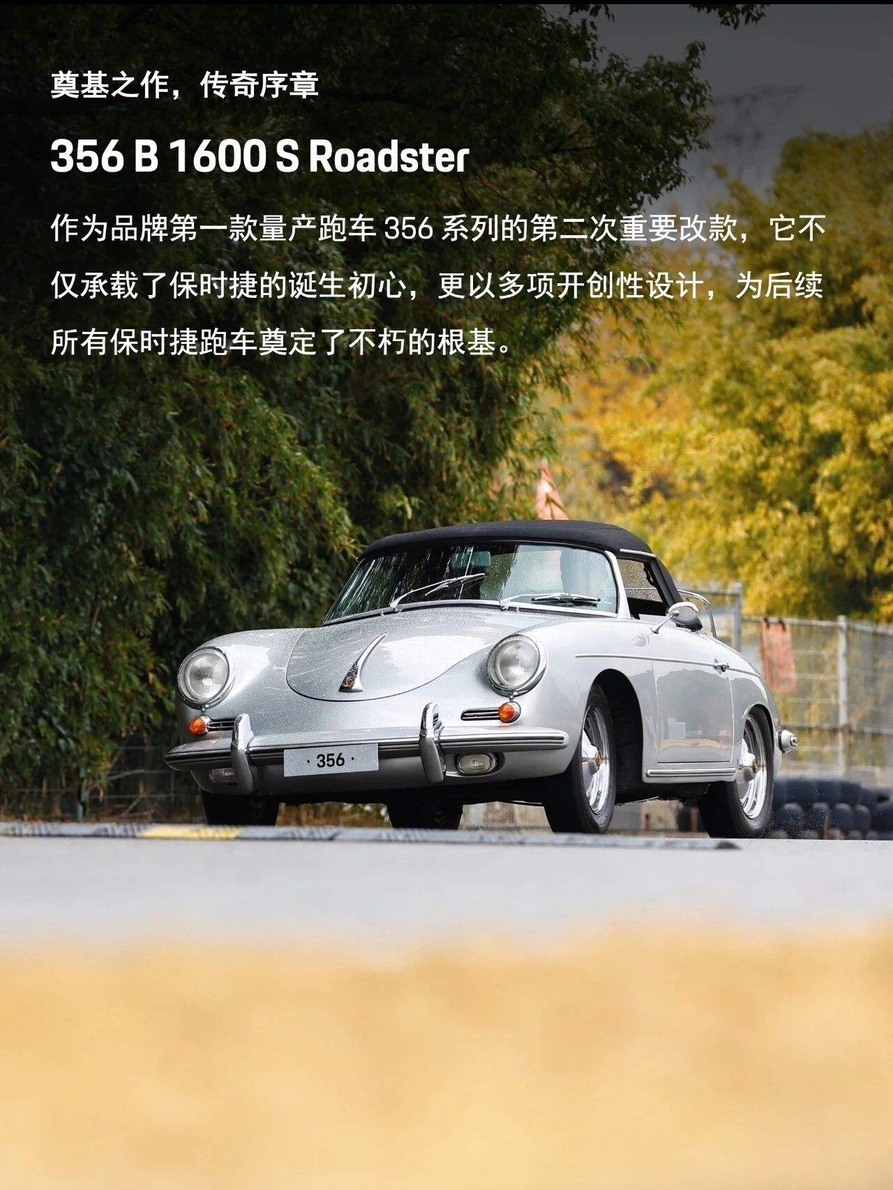 这辆来自1961年的保时捷 356 B 1600 S Roadster,是“保”藏车库中最资深的成员,更是保时捷传奇故事的序章。作为品牌第一款量产跑车356系列的第二次重要改款,它不仅承载了保时捷的诞生初心,更以多项开创性设计,为后续所有保时捷跑车奠定了不朽的根基。 Roadster这一经典车身形式可追溯至品牌鼻祖——1948年的 356 “No.1” Roadster,象征着敞篷驾驶的最初乐趣。其尾标“1600”代表其搭载了1.6升水平对置四缸风冷发动机,而“S”则意味着更高的性能调校。更重要的是,它为在当时的GT赛事中保持竞争力而生,采用了特殊的轻质车身结构。